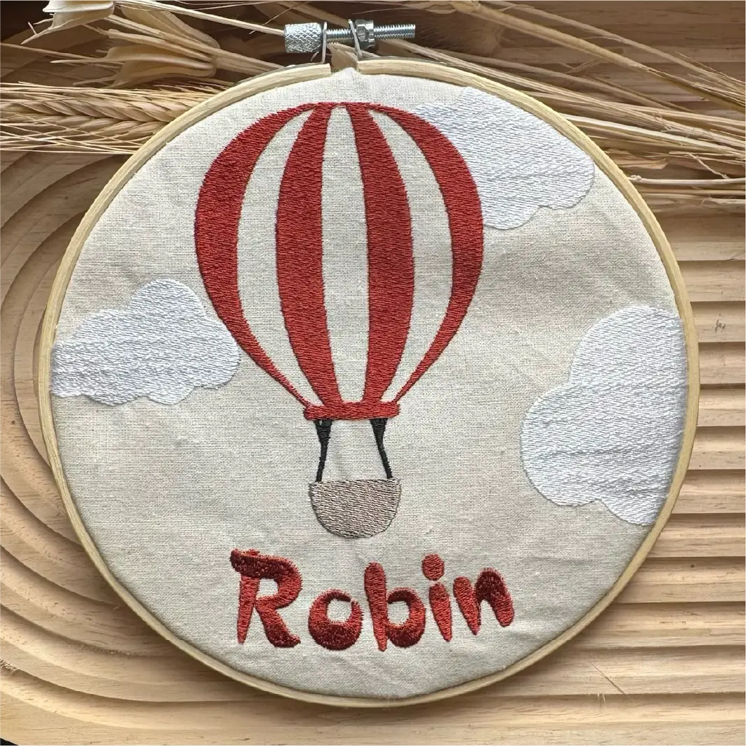 Een naam naar keuze geborduurd met onze 15-naalds borduurmachine op een beige canvasdoek.
